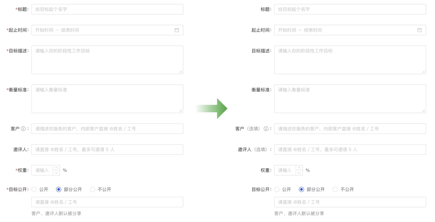 - 極簡處理:必填項占絕大多數時,隱藏選填提示符,減少視覺干擾