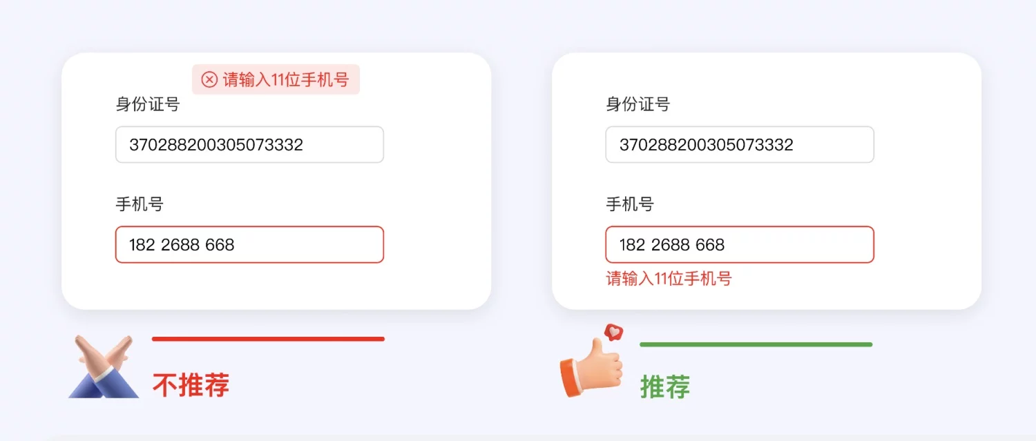 - 錯誤提示就近展示,明確錯誤原因 + 修改建議