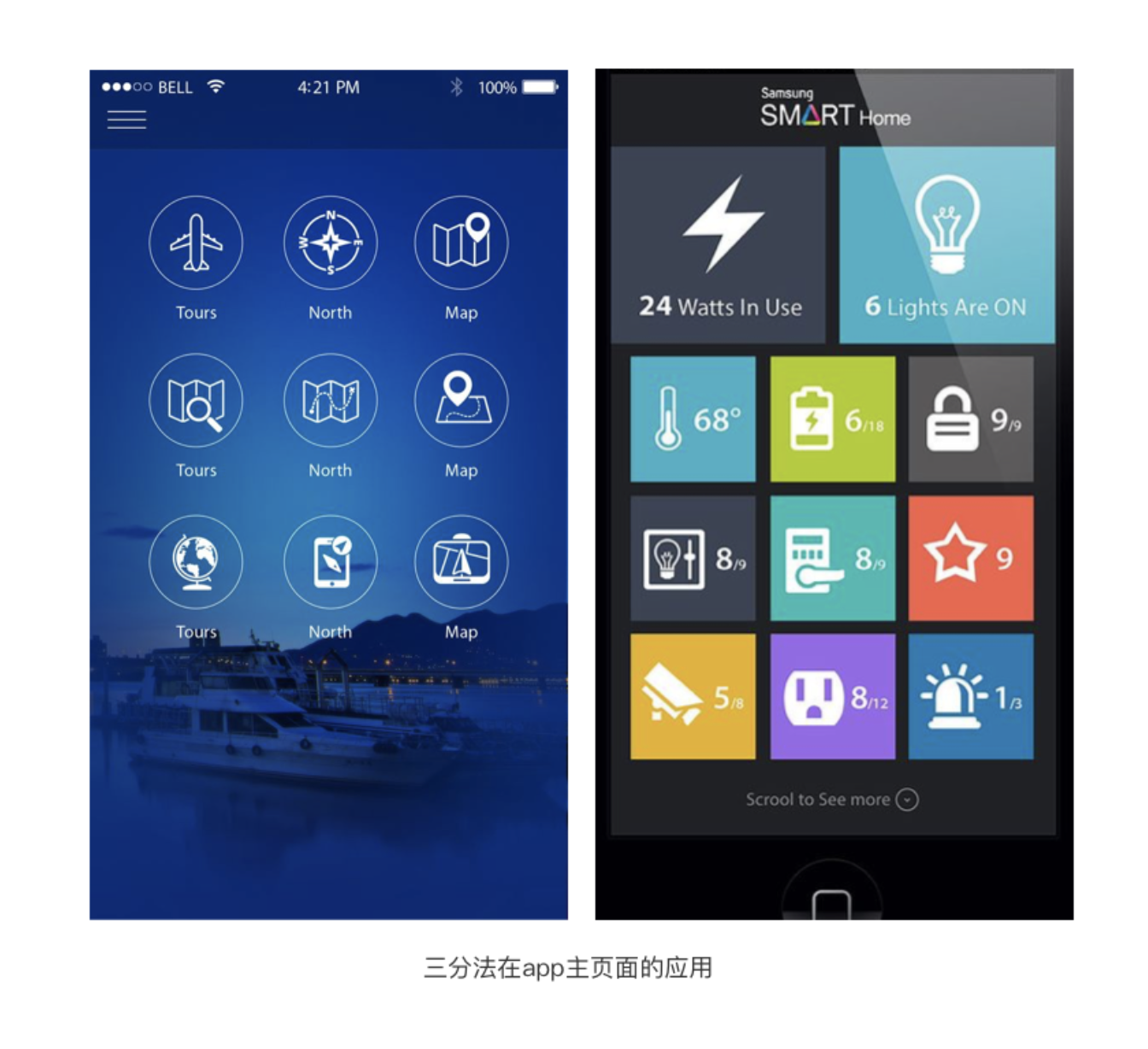 三分法構圖指將界面的長與寬各橫向、縱向三等分,形成九宮格式的分割線,分割線的交點或每一分的中心位置,都是視覺焦點區域,適合放置界面的核心主體元素。幾乎所有 APP 的功能主體設計,都能找到三分法構圖的影子,其核心是利用視覺偏好,讓用戶快速捕捉核心信息。