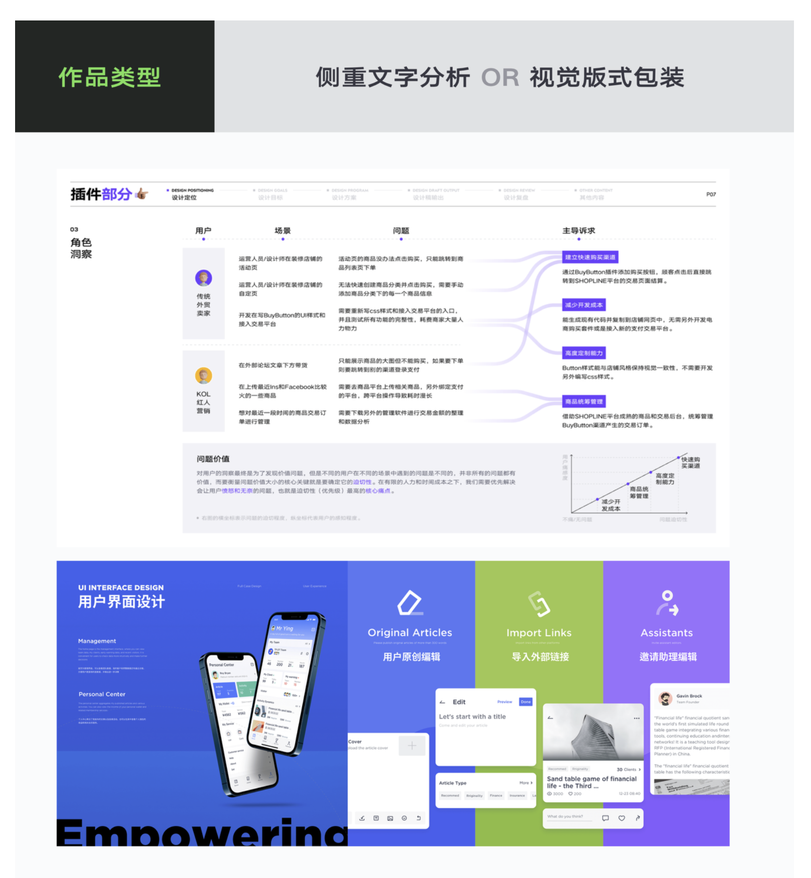 如果你擅長視覺設計,版式、色彩、細節(jié)把控能力突出,那么可以把作品集的重點放在視覺包裝上,推理分析簡單梳理即可,用視覺驚艷打動面試官;如果你設計思維強,擅長發(fā)現(xiàn)問題、解決問題,那么可以側重推理分析的深度,用邏輯體現(xiàn)專業(yè);如果兩者都擅長,那就將視覺與分析結合,這是最理想的狀態(tài)。