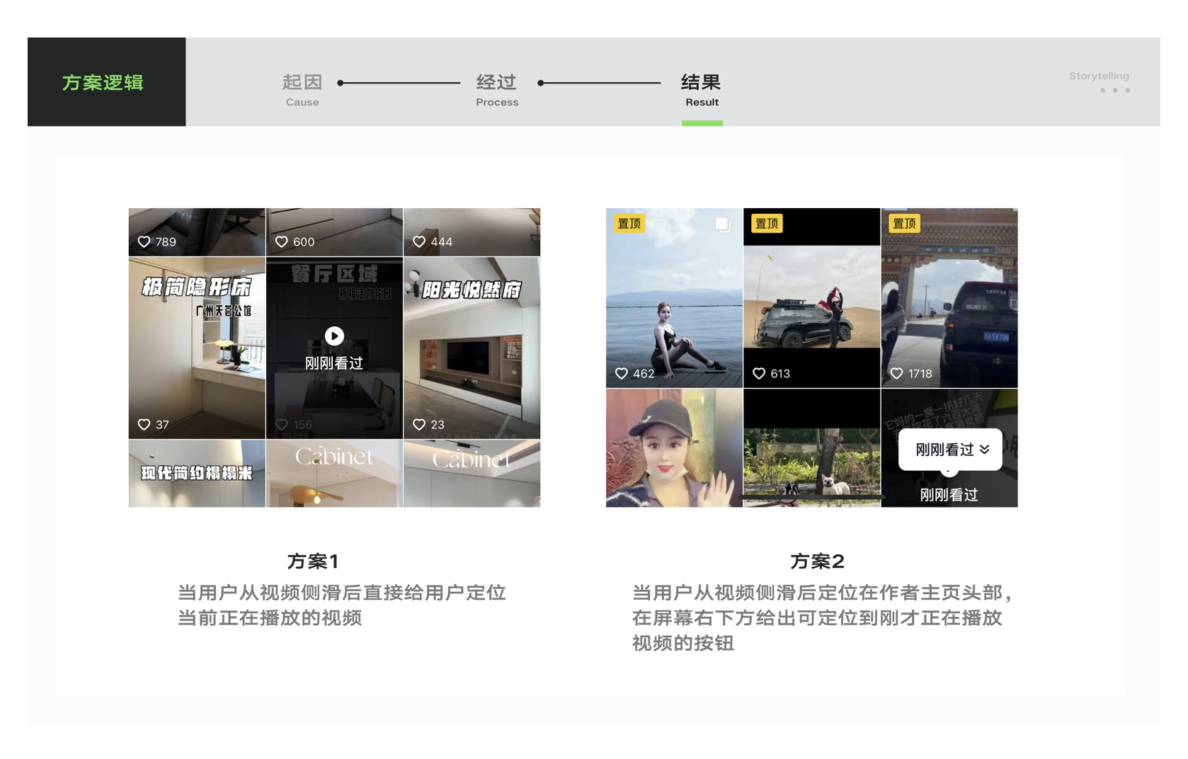 比如,蘭亭妙微在為某短視頻平臺設計 “系列視頻查看功能” 時,提出了兩個方案:方案一是用戶側滑后直接定位到當前播放的視頻,優(yōu)點是操作高效,缺點是減少了用戶與作者主頁的互動;方案二是用戶側滑后先進入作者主頁頭部,右下角增加 “剛剛看過” 按鈕,點擊可定位到視頻,優(yōu)點是能提升作者關注率,符合平臺 “強化創(chuàng)作者與用戶鏈接” 的業(yè)務目標,缺點是多了一步操作。最終我們選擇了方案二,因為它既解決了 “用戶找不到系列視頻” 的核心問題,又兼顧了平臺的商業(yè)價值 —— 這就是清晰的取舍理由。