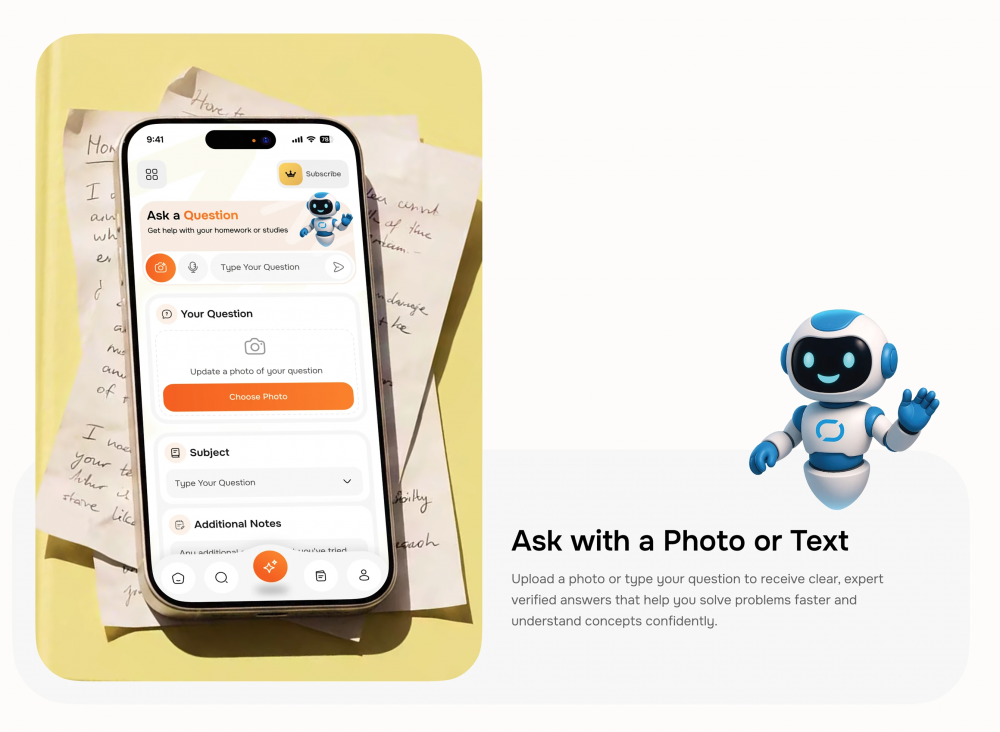 色彩體系以柔和暖橙搭配干凈白色為主,局部點綴低飽和亮色區(qū)分學(xué)科與功能模塊,視覺上清新治愈,有效緩解長時間使用的視覺疲勞。界面布局遵循移動端通用交互習(xí)慣,底部固定核心導(dǎo)航欄,首頁核心功能入口直觀展示,提問、搜題、文庫、個人中心等高頻功能一鍵可達,操作路徑極簡,新手也能快速上手。