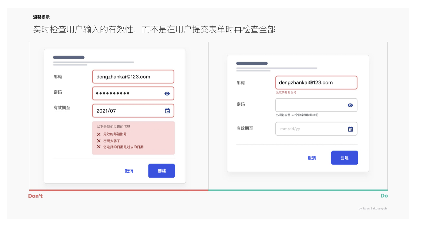 - 避免「提前校驗(yàn)」,即在用戶未完成輸入時(shí),不隨意標(biāo)記字段為無效,防止引發(fā)用戶的焦慮感;