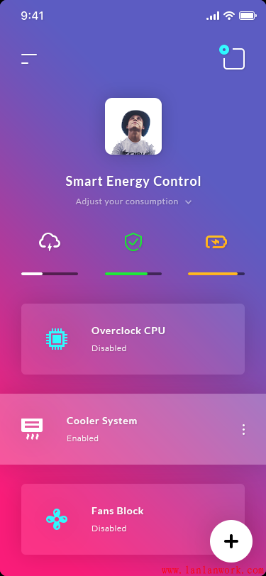 這款A(yù)PP界面采用深灰色底色,沉穩(wěn)大氣,有現(xiàn)代科技感,界面采用卡片式布局。配以粉紅和橘黃作為點(diǎn)綴,讓界面不因深色而顯得呆板。