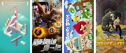 對游戲應用來說,你的主要目標是調動起用戶的情緒(而不是展示功能)。選擇游戲中史詩般的場景和驚心動魄的畫面去凸顯游戲的樂趣。讓用戶在安裝這個app以前就能夠所感受到快樂的預感;用標題講故事,通過展示徽章和獎勵來吸引玩家。