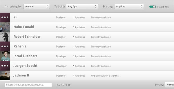 當有大量數據要處理的時候過濾就很有用。使用下拉列表,單選按鈕或者復選框進行過濾選擇。 在下面的例子里, builditwith.me使用下拉列表來對用戶的職業興趣和當前狀態進行過濾。