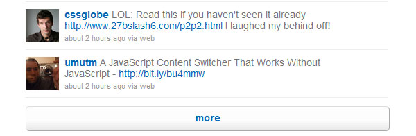 這種方式有一種變異版(或者說另外一種方式)。與不間斷的滾動顯示數據不同,在列表的最后,用戶可以選擇點擊更多按鈕瀏覽數據。Twitter就是這樣的一個好范例。