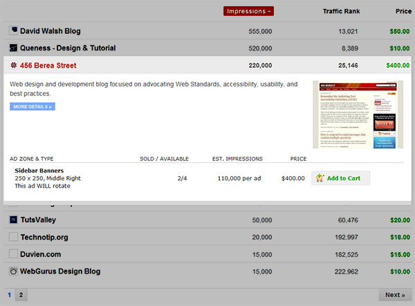 關于這種模式我寫過一篇文章,也建了一個可以輕松實現的jQuery小插件。 這種模式的關鍵點就是可以給表格增加更多相關信息功能。以BuySellAds為例,展開行顯示了出版商的廣告詳細信息,同時始終顯示主行里的重要信息。