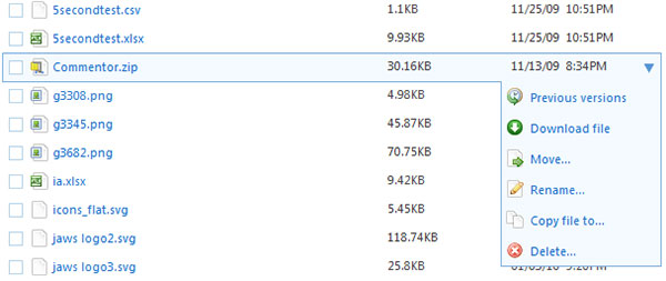 這種方式可以很好地讓用戶批量完成多行的操作。選中每一行前面的復選框,點擊批量操作鏈接或按鈕,用戶可以選中多行進行操作。還是以DropBox為例,用戶可以選中多條文件,點擊菜單進行批量操作。