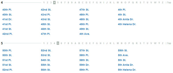Product Planner 采用了標準的分頁顯示,有頁碼數字,有上一頁下一頁。但是,你能告訴我第2頁是什么? 第3頁?當然你不能。不用擔心,標準分頁可以得到改善。如下所示,通訊錄很龐大,他們使用了數字和字母來分頁。在這個例子里顯示所有的頁和隱藏頁一樣好。你可以以此類推應用到其他條件相似的表格。如果表格以日期來分類,你可以以日期范圍來替代傳統的分頁數字(如第1頁可以寫成2.10-2.12,等等)