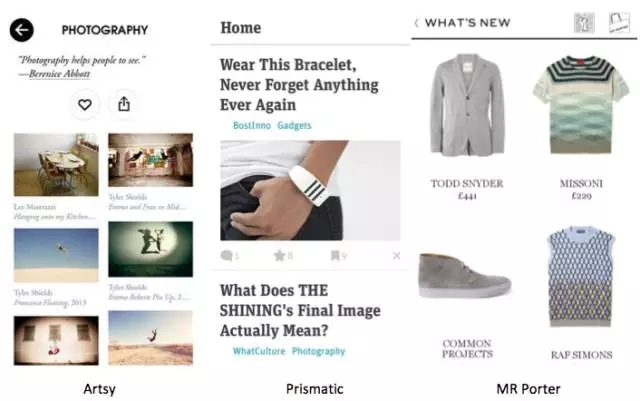 Artsy的圖片瀑布流,完全沒(méi)有用到線和面來(lái)區(qū)分信息組塊,而就是用內(nèi)容本身做排版,用戶可以更加集中注意力于圖片內(nèi)容上。Prismatic利用字體排版,盡可能的內(nèi)容前置,弱化圖標(biāo)和操作,讓用戶更集中注意力于內(nèi)容閱讀上。而MR Porter則利用商品圖片、名稱和價(jià)格直接做設(shè)計(jì),讓用戶聚焦于商品本身。