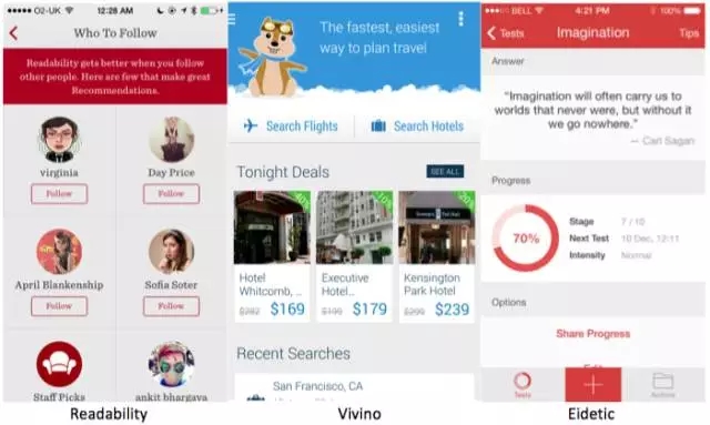 Readability采用紅色主色調(diào)設(shè)計(jì),連提示信息背景色、線性按鈕和圖標(biāo)都采用紅色主色調(diào),界面和LOGO也完全是一個(gè)色系的。而Vivino采用藍(lán)色主色調(diào)設(shè)計(jì),信息用深藍(lán)、淺藍(lán)加以區(qū)隔。Eidetic采用橙色主色調(diào)設(shè)計(jì),其中的關(guān)鍵操作按鈕甚至整個(gè)用橙色提亮,信息圖標(biāo)也用深橙色、淺橙色來(lái)表達(dá)程度。 可以說(shuō)唯一主色調(diào)設(shè)計(jì)手法,是真的做到了移動(dòng)端APP的最小化(Minimal)設(shè)計(jì),減少冗余信息的干擾,使用戶專注于主要信息的獲取。