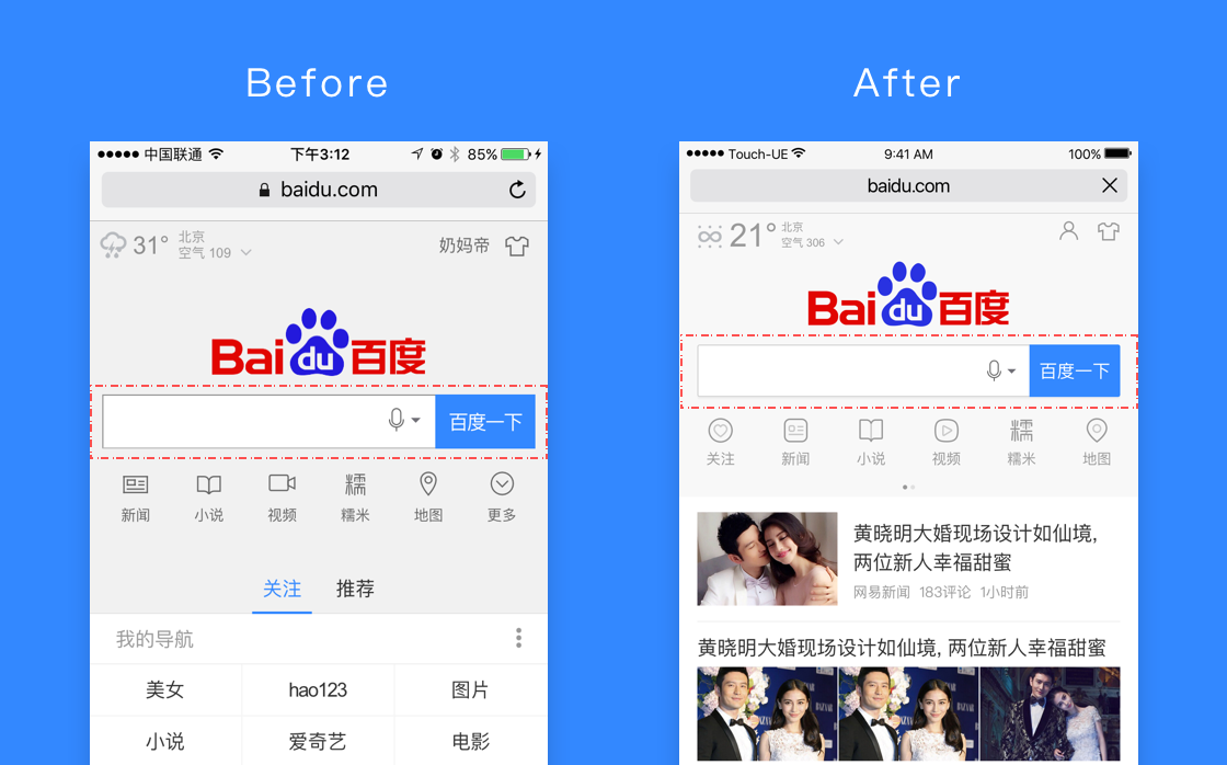 讓搜索干干凈凈,清晰的視覺風(fēng)格,去掉搜索框的效果修飾, 背景顏色更加清爽。 這是我們百度首頁UE團(tuán)隊的工作理念和設(shè)計觀,這是我們團(tuán)隊元思考和組織建設(shè)的基礎(chǔ)。經(jīng)過不斷的磨煉與反思,我們充分認(rèn)識到了工作理念和設(shè)計觀對于一個團(tuán)隊的重要性,我們時刻在提醒自己,要不斷對已有的經(jīng)驗和結(jié)論進(jìn)行反思,要從更多的視角對它進(jìn)行觀察和思考。只有與時俱進(jìn),才能生生不息。