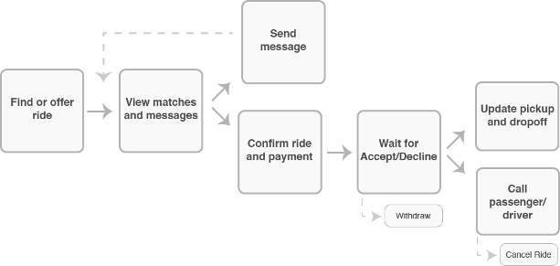 為此,我參考了其他一些協(xié)同消費 (Collaborative Consumption)類型的應用產(chǎn)品,例如Airbnb 和Yardsale 等等。在嘗試了多種流程及界面布局方式之后,我們決定采用一種輕量級的確認序列機制,它的操作界面類似于大家所熟悉的短消息界面。無論駕車者還是搭乘者都可以發(fā)起確認;例如,旅程結束后,一旦搭乘者完成了支付,駕車者收到款項,此次拼車活動就會被確認完成。