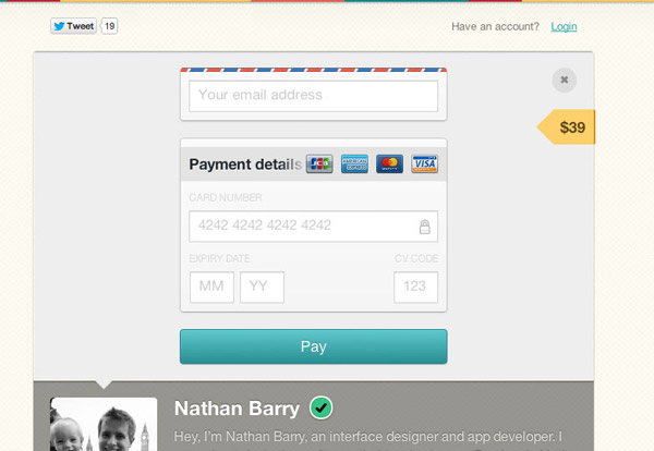 Gumroad在未登錄狀態(tài)的支付表單中剔除了很多常見的“必填”字段,最終只保留了用于輸入郵箱地址、信用卡號(hào)、有效期和CV碼的文本框。如果連未登錄時(shí)的支付環(huán)節(jié)都可以被如此簡化,我相信對(duì)于其他方面業(yè)務(wù)的那些復(fù)雜表單來說,不會(huì)沒有優(yōu)化空間的。