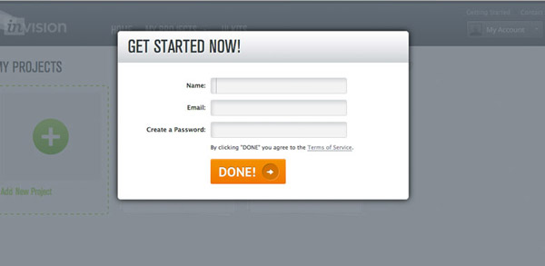 在對(duì)表單進(jìn)行了充分的簡化之后,我們還可以試著通過一些設(shè)計(jì)技巧讓填寫表單的環(huán)節(jié)看上去更輕量。在這方面,我個(gè)人最喜歡的一個(gè)案例來自原型制作工具InVision的注冊(cè)表單。他們使用浮層的形式呈現(xiàn)表單,作為訪問者,我可以感知到,當(dāng)我填寫完成之后就可以立刻回到之前的界面繼續(xù)應(yīng)用流程。