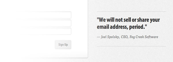 在為訪問者提供積極引導(dǎo)的同時(shí),我們還要想辦法避免掉那些負(fù)面因素。人們?cè)谔顚懕韱螘r(shí)的最大顧慮就是信息被網(wǎng)站方收集之后的用途。用戶不會(huì)希望收到垃圾郵件,更不愿意自己的個(gè)人信息被傳播出去。如果你確實(shí)運(yùn)營著一個(gè)值得信賴的產(chǎn)品,那么不妨直接讓用戶知道你不會(huì)把他們的信息販賣出去或是向他們發(fā)送垃圾郵件,就像FogBugz做的那樣,在注冊(cè)表單旁邊以非常直白的口語化的方式告訴用戶“我們不會(huì)出售或分享你的郵箱地址,就是這樣。”