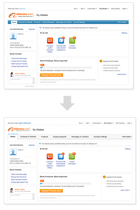 上圖我們團隊對alibaba.com提供的服務介紹頁面進行改版的項目,改版前的設計層級區分不明顯,使得用戶進入該頁面時不能快速了解服務的概況,來判斷是否繼續深入了解;而改版后通過大小的對比,呈現抓住用戶第一眼印象的信息,初步判斷符合自己的需求,用戶才會繼續瀏覽。