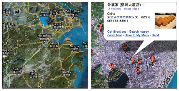 左地圖是市級展示的地名,當用戶搜索到街道級別時,才會把本街區內的店鋪展示給用戶,在特定的情況下只展示必要的信息,有利于用戶找到自己的目標