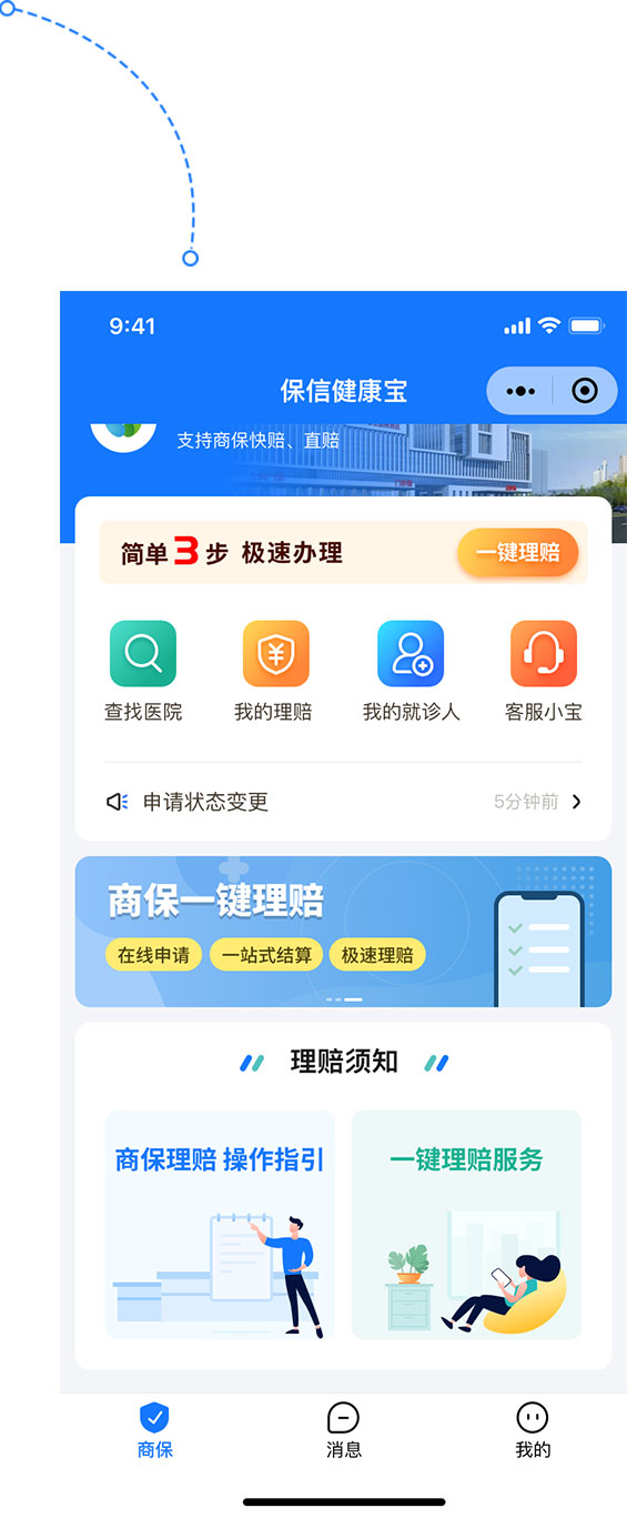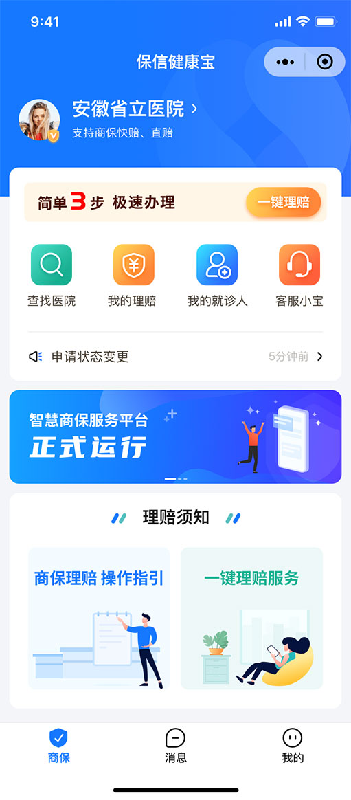 保信健康寶是聯合保險公司、醫院打造的智慧商保報案統一的線上理賠服務平臺,該平臺無需用戶線下跑腿,醫療數據采用區塊鏈技術和銀行級加密傳輸,數據安全雙保險。科技賦能理賠審核,極速提升理賠效率,理賠款直接轉入用戶指定銀行。