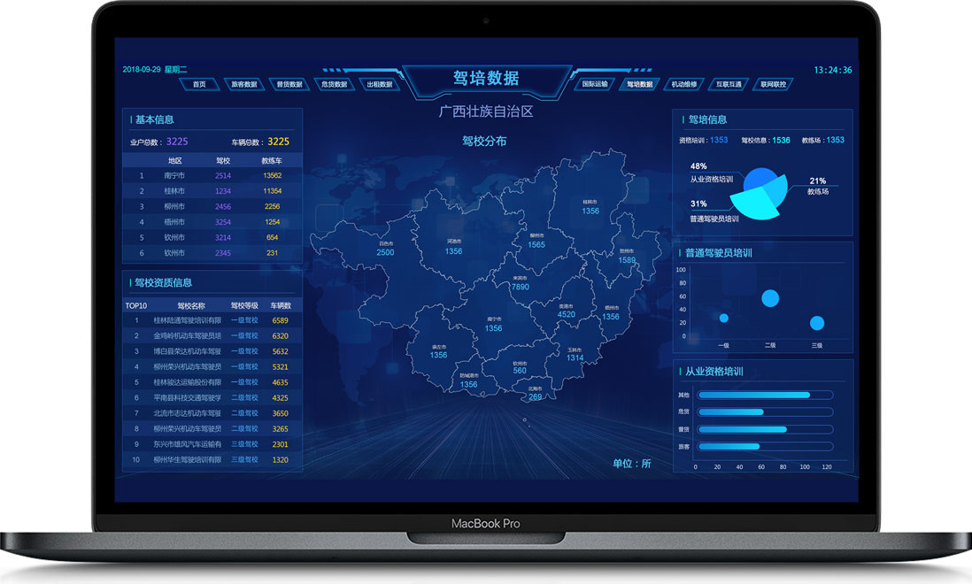 行業態勢展示了道路交通運輸行業的基礎數據和走勢,實時反映行業的運行狀態,將采集的數據形象化、直觀化、具體化。為了加強某些重點工作,我們還需加入“聯網聯控”、“互聯互通”等相關專題。系統所具備的數據管理能力可將現有的數據進行有效的整合,快速準確地提供報表并提出決策依據。